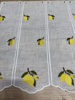 Fehér alapon hímzett citrom mintás vitrázs függöny.