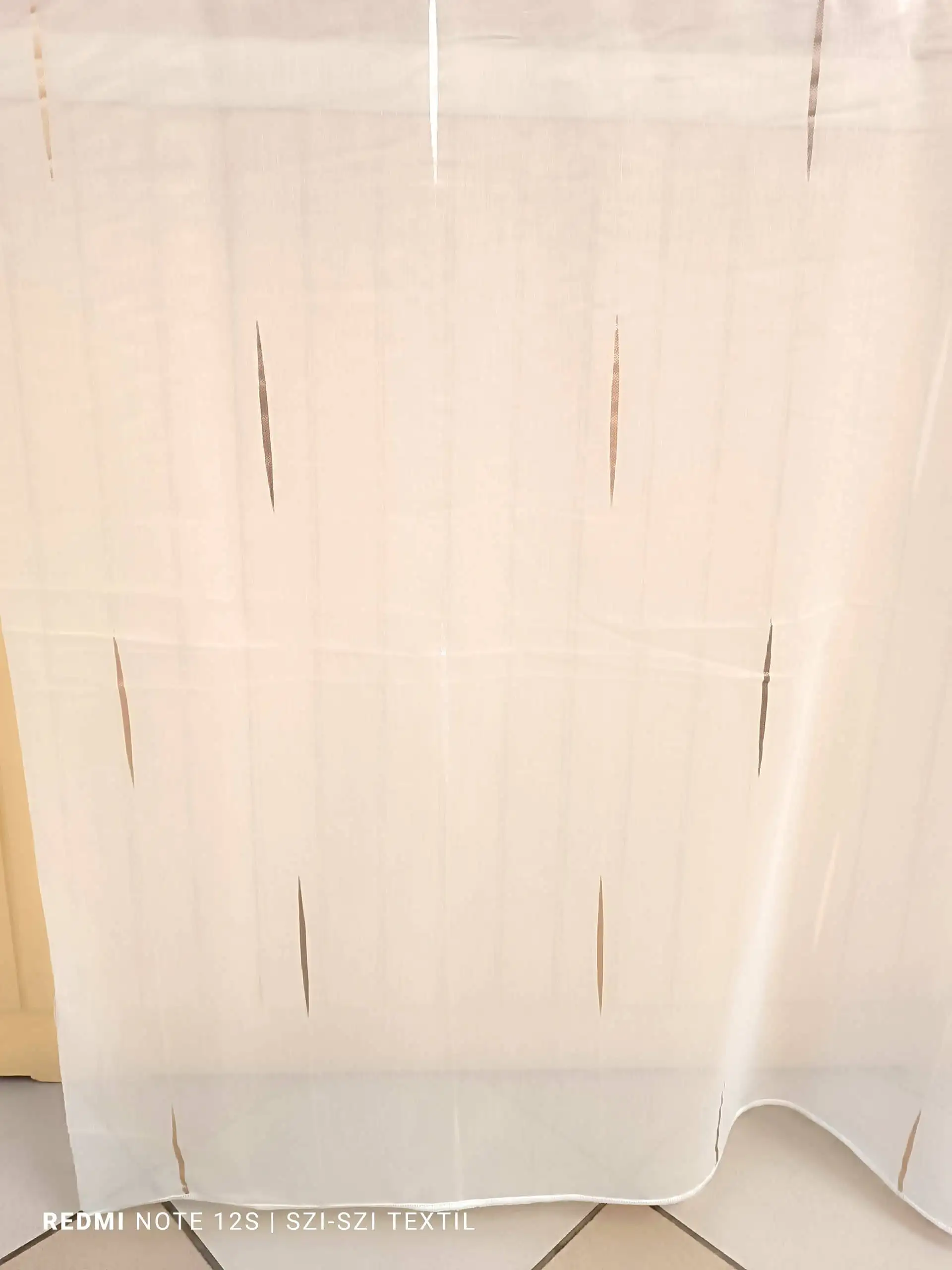 Fényáteresztő függöny 175cm magas, Fehér voile , fehér-barna-drapp szatén beszövéssel.