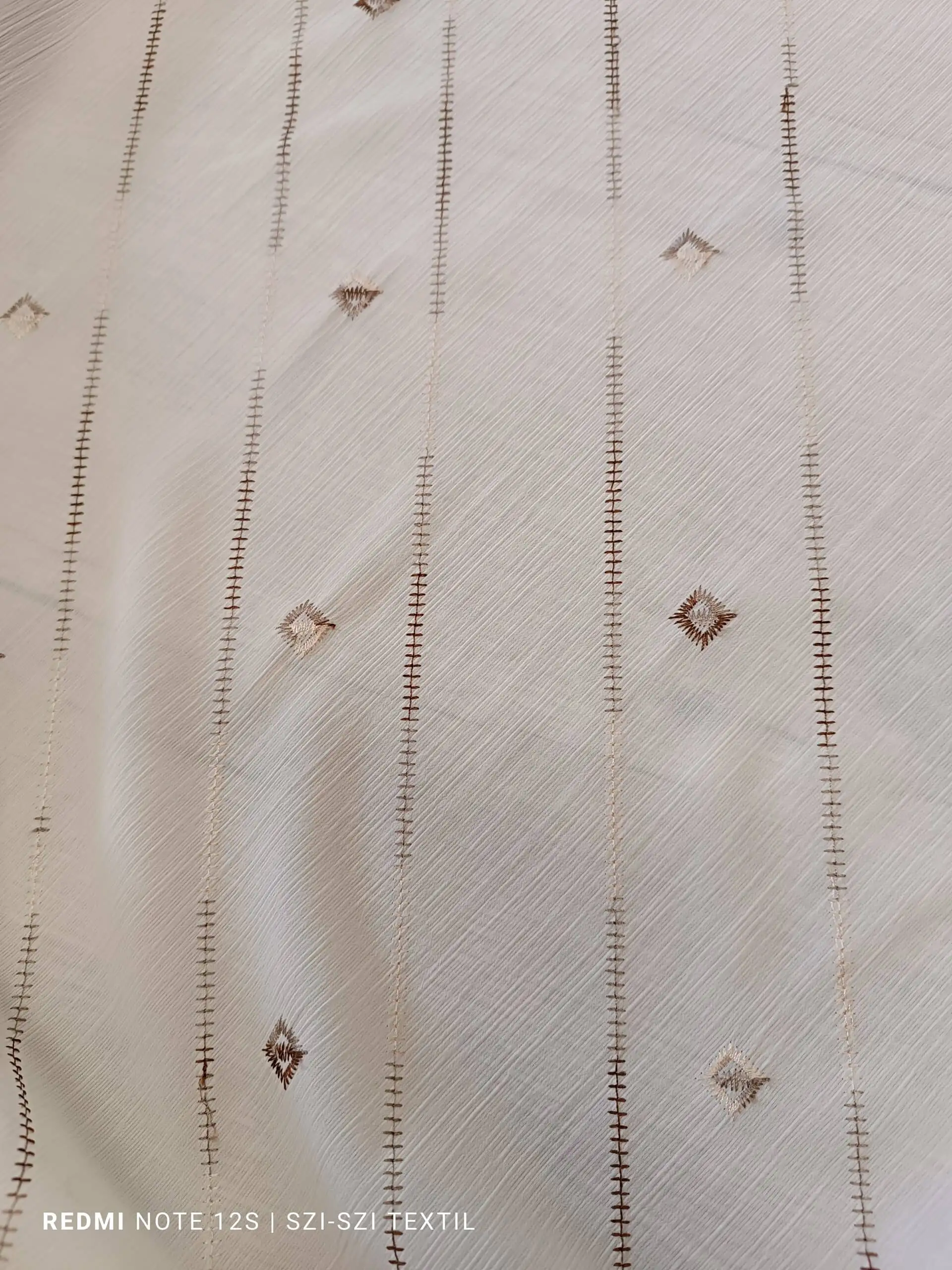 Tört fehér plisszé drapp-barna hímzéssel 150cm széles. Hibás hímzés!