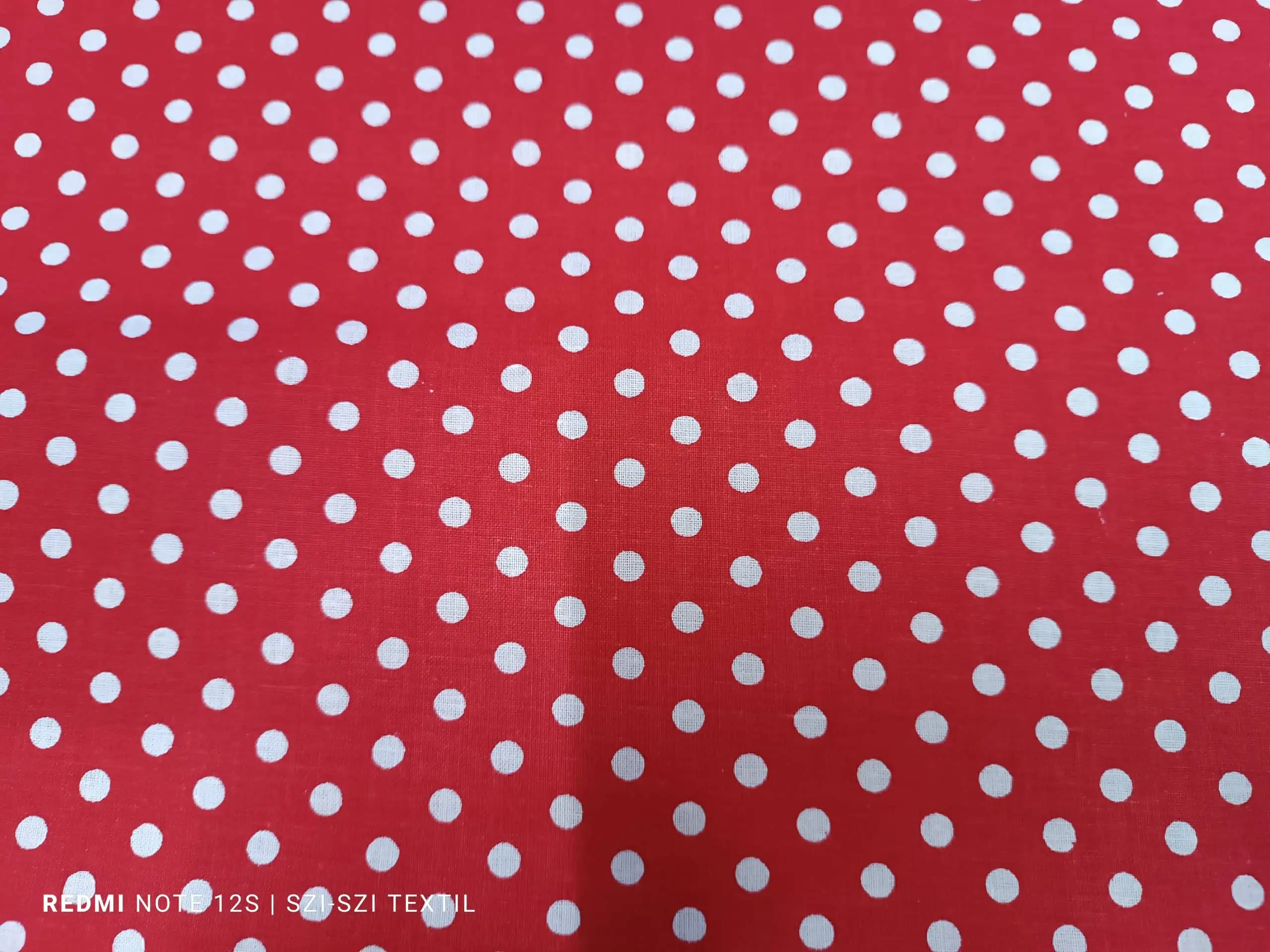 Piros alapon fehér pöttyös pamutvászon. Könnyen lélegző, természetesen anyag.