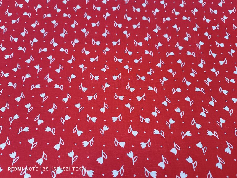 Piros alapon fehér tulipán mintás pamutvászon. Könnyen lélegző, természetesen anyag.