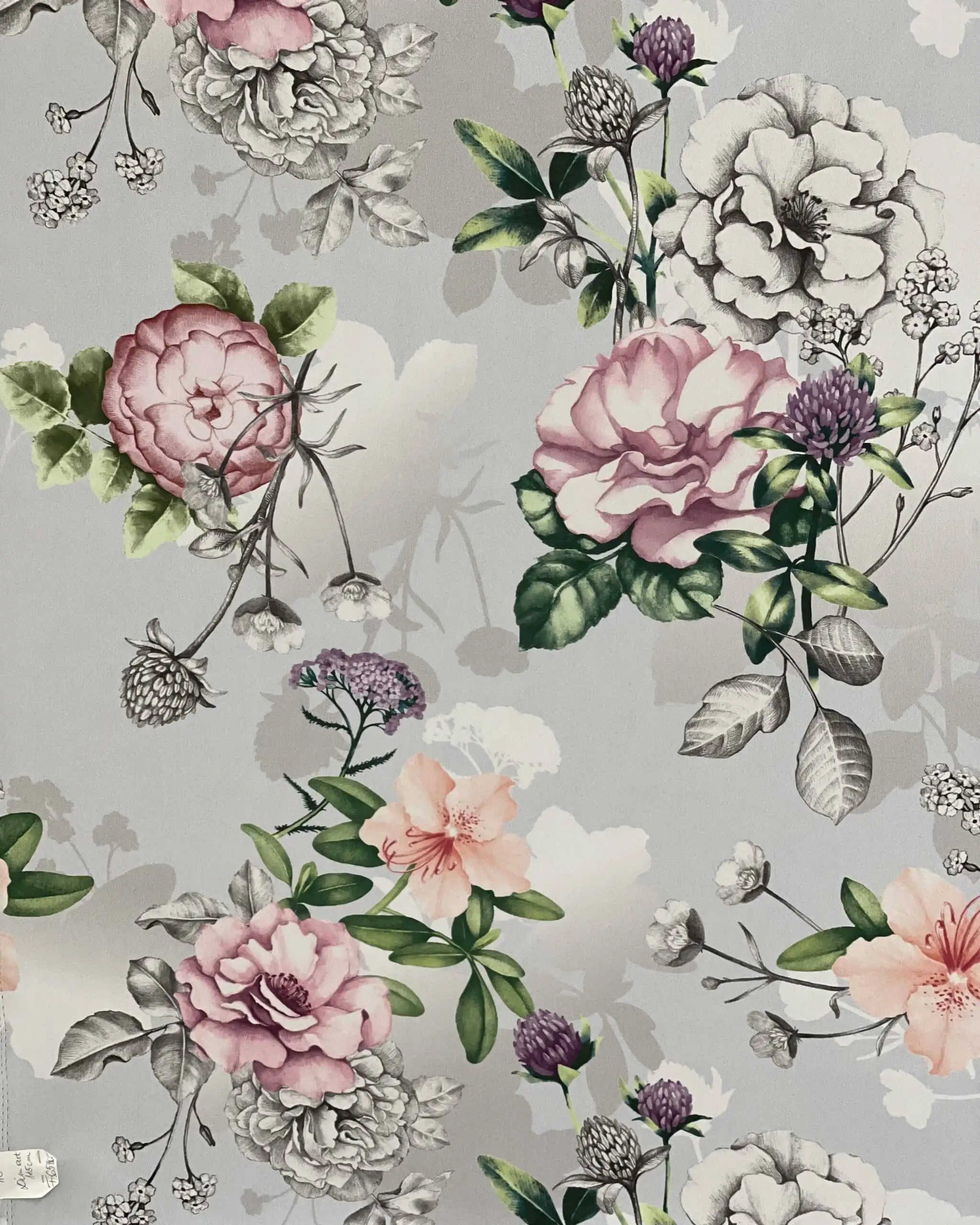 Világosszürke-drapp-mályva-zöld nyomott virágmintás dim out.